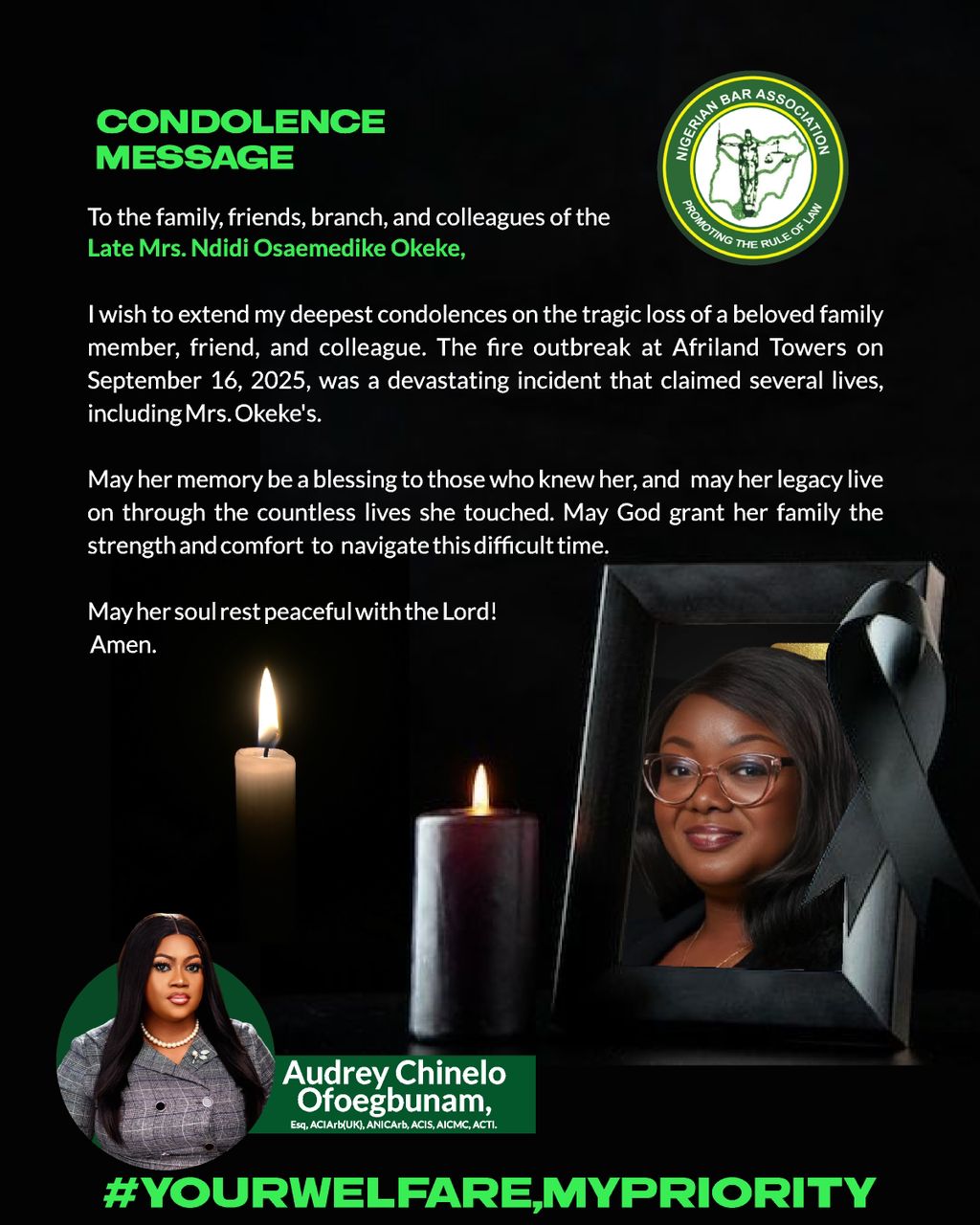 In light of the tragic loss of Mrs. Ndidi Osaemedike Okeke in the Afriland Towers fire outbreak on September 16, 2025, Audrey Chinelo Ofoegbunam calls on the Nigerian Fire Service to intensify efforts in fire prevention, preparedness, and response.