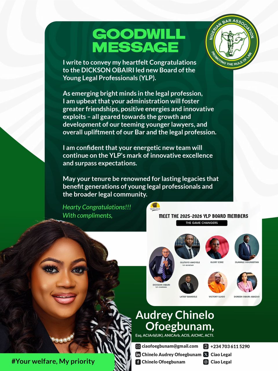 I write to convey my heartfelt Congratulations to the DICKSON OBAIRI led new Board of the Young Legal Professionals (YLP).