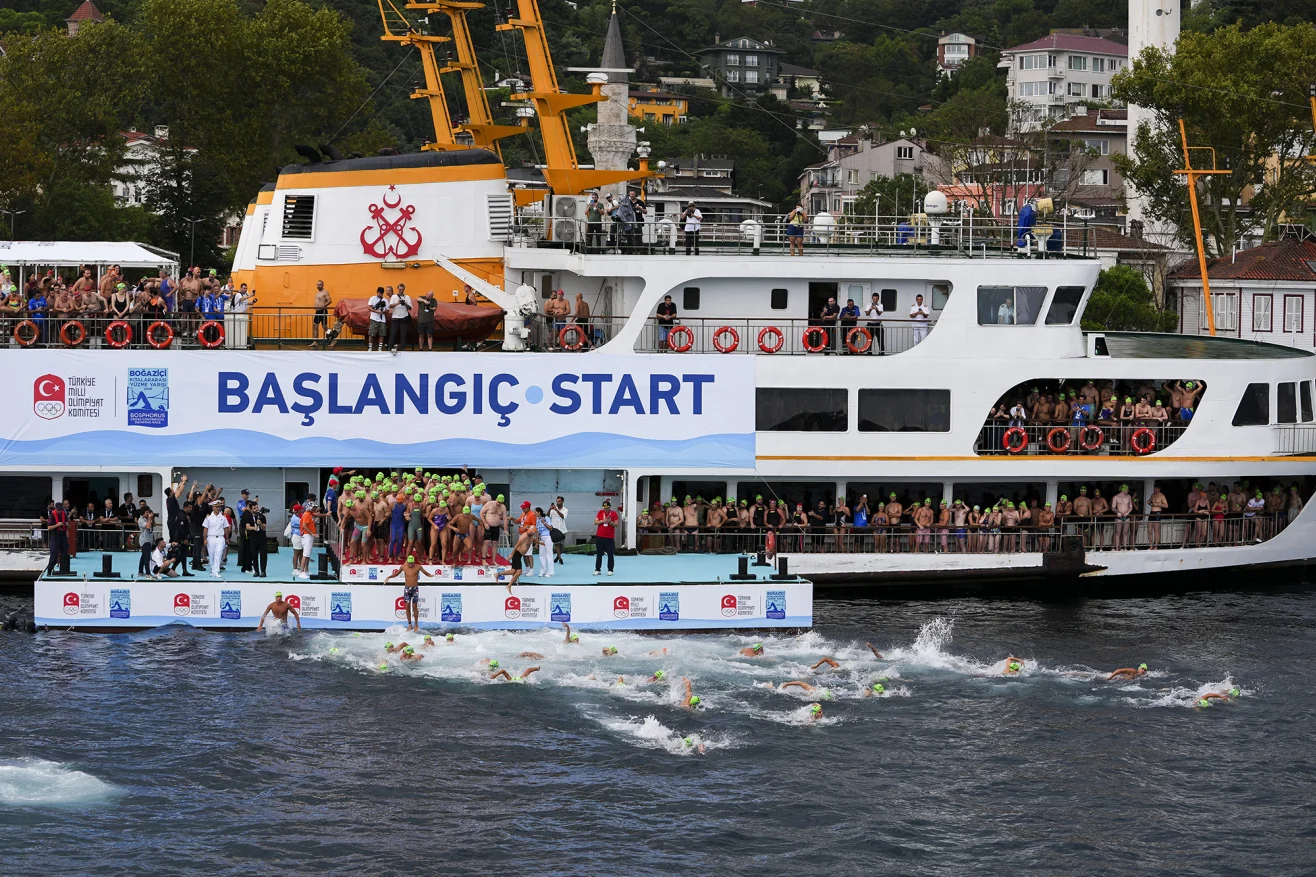 Because the race runs downstream, swimmers gather first at the finish line, in Cemil Topuzlu Park on the European side, then board boats to the start point just north of the Fatih Sultan Mehmet Bridge, on the Asian side.