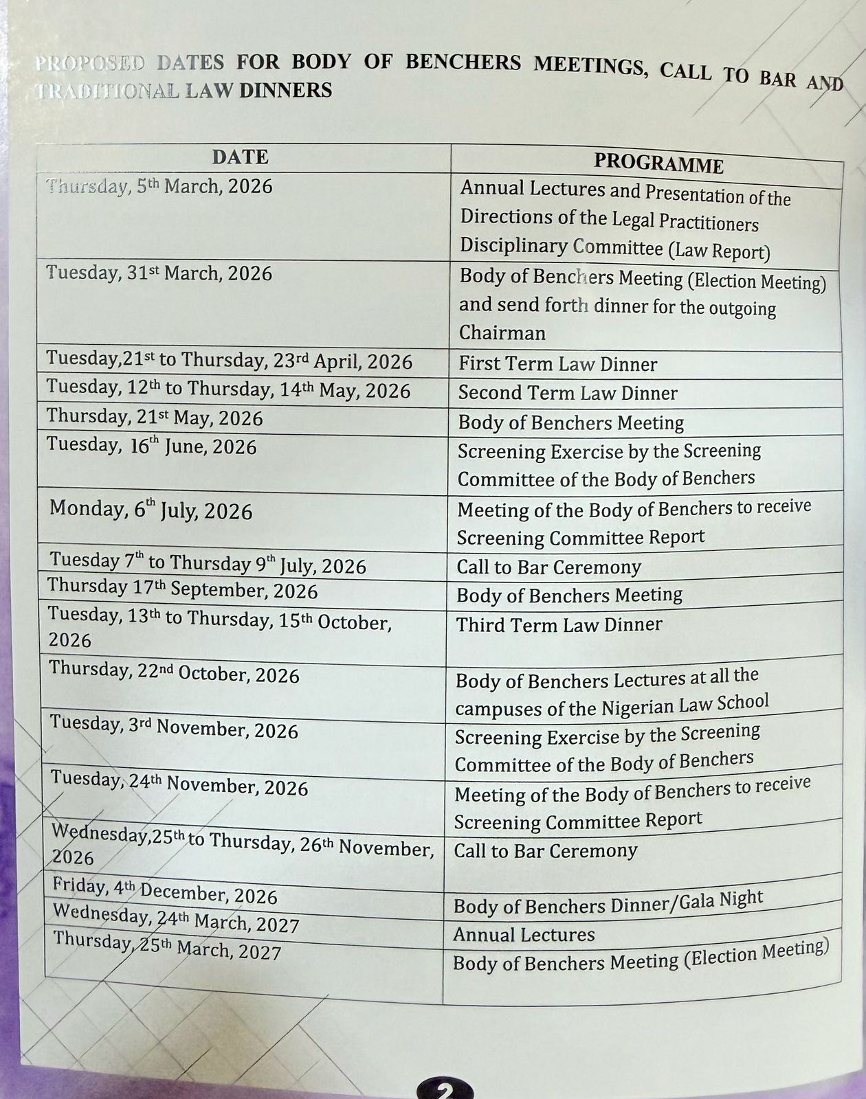 Nigeria’s legal calendar for 2026 has taken a clearer shape as the Body of Benchers unveiled a comprehensive timetable covering meetings, law dinners, and multiple Call to Bar ceremonies, offering the clearest signal yet of the pipeline for new legal practitioners.