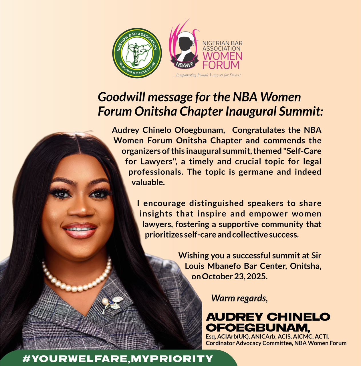 Audrey Chinelo Ofoegbunam, Congratulates the NBA Women Forum Onitsha Chapter and commends the organizers of this inaugural summit, themed “Self-Care for Lawyers”, a timely and crucial topic for legal professionals. The topic is germane and indeed valuable.