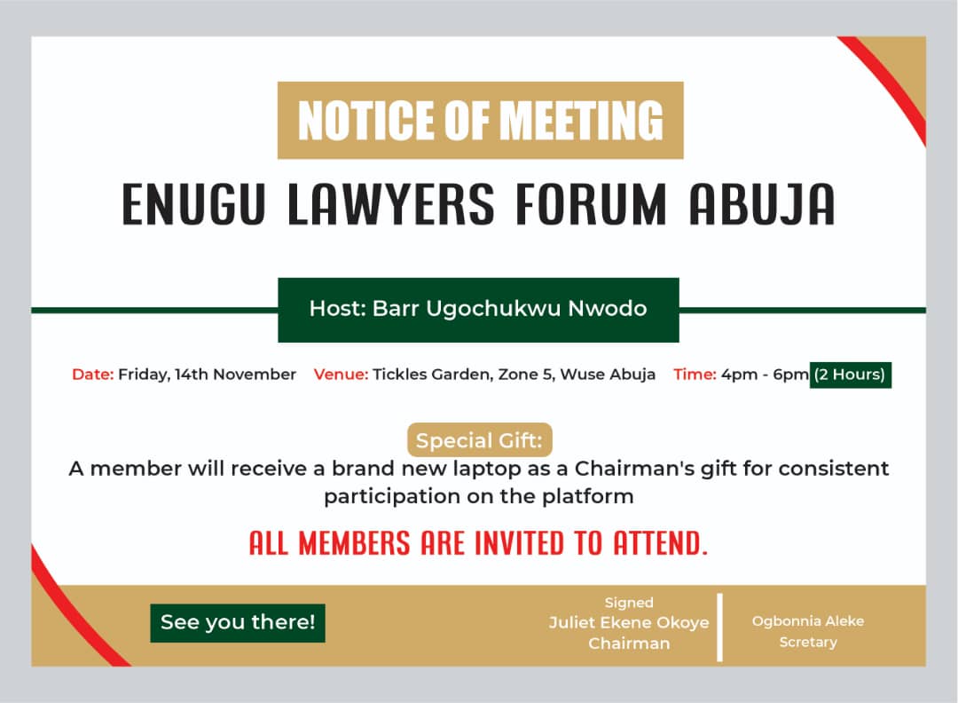 It’s going to be a night of brilliant minds and bold ideas as the Enugu Lawyers Forum, Abuja Chapter, gathers for an exclusive meeting and networking event on Friday, November 14.