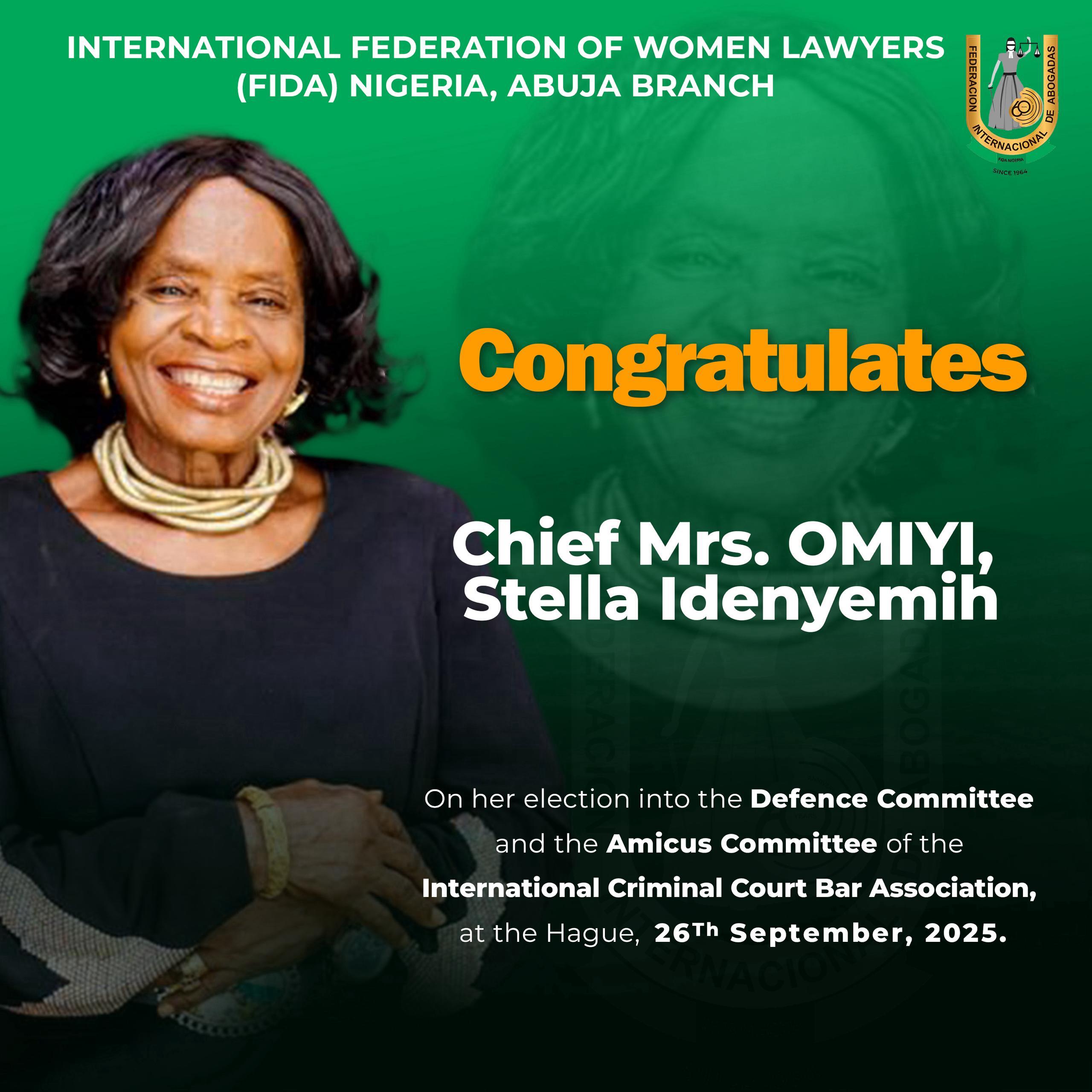 FIDA Nigeria, Abuja Branch, heartily congratulates a distinguished elder of our branch, Past Country Vice President of FIDA Nigeria and Past Regional Vice President of FIDA International – Chief (Mrs.) Idenyemih Stella Omiyi – on her recent election into the Defence Committee and the Amicus Committee of the International Criminal Court Bar Association (ICCBA) at the Hague, Netherlands, on the 26th of September, 2025.