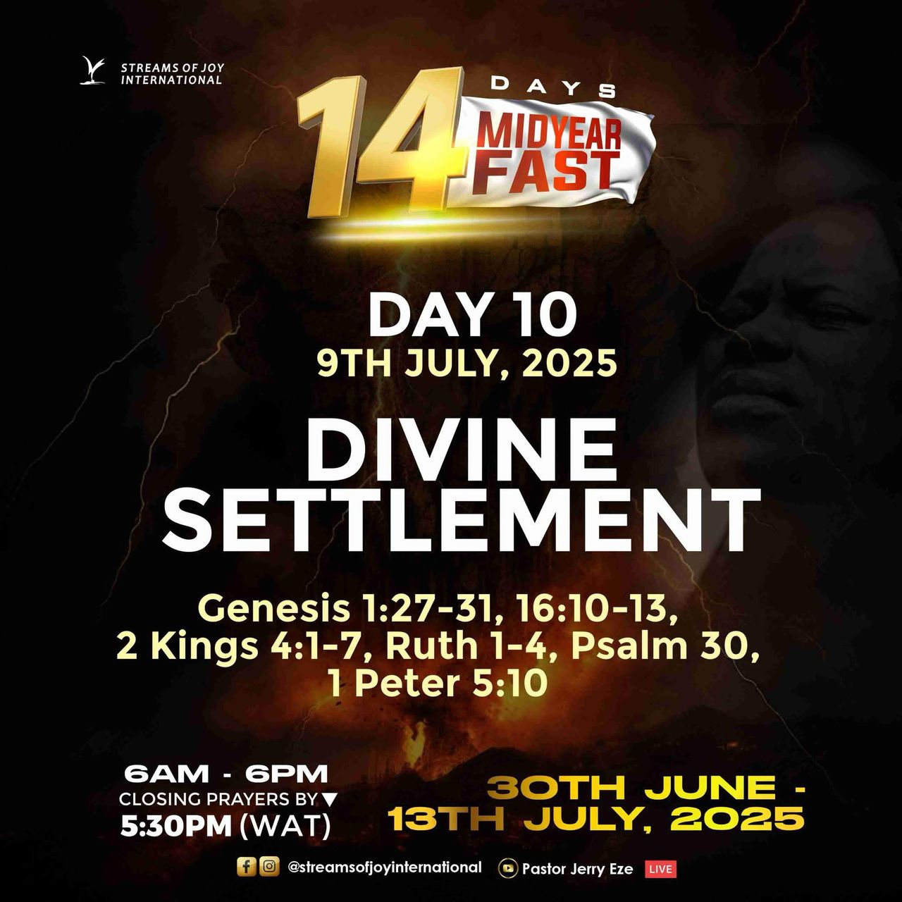 NSPPDIANS, Day 10 IS HERE!!! It’s our Day to enforce our “DIVINE SETTLEMENT”. Study/Meditate on Genesis 1:27–31, Genesis 16:10–13, 2 Kings 4:1–7, Ruth 1–4, Psalm 30, 1 Peter 5:10