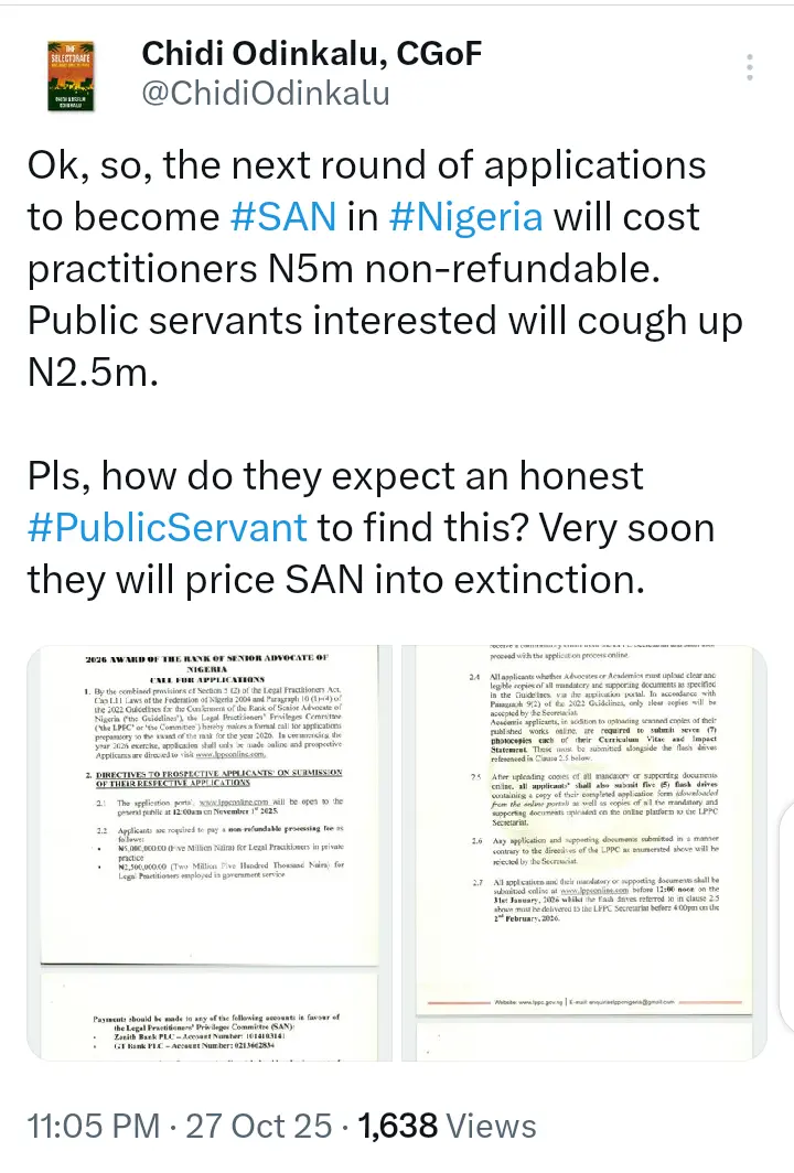 Human rights lawyer Professor Chidi Odinkalu condemned the policy on X, asking, “How do they expect an honest public servant to find this money?” He warned that the title could soon be “priced into extinction.”