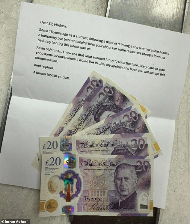 The letter said: “Some 15 years ago as a student, following a night of drinking, I and another came across a temporary PVC banner hanging from your shop. For some reason we thought it would be funny to bring this home with us.