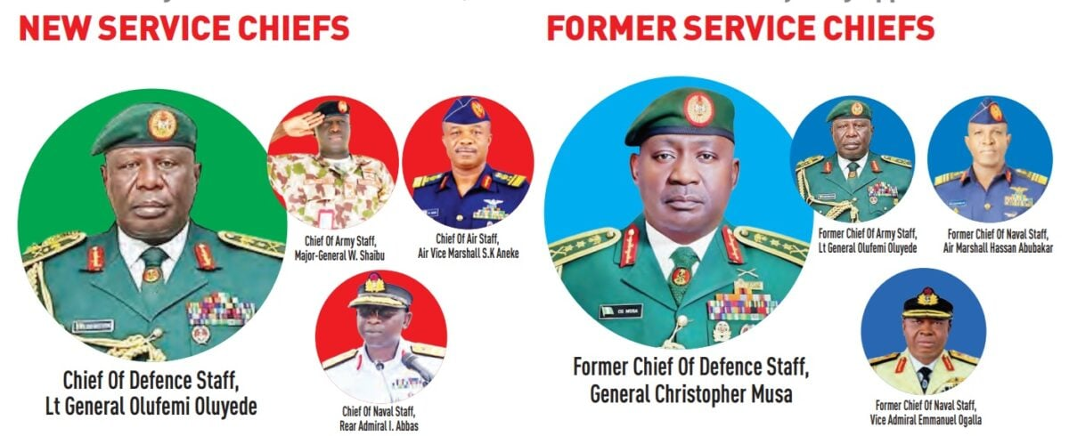 Their replacements include General Olufemi Oluyede as Chief of Defence Staff, Major-General W. Shaibu as Chief of Army Staff, Air Vice Marshal S. K. Aneke as Chief of Air Staff, and Rear Admiral I. Abbas as Chief of Naval Staff.
