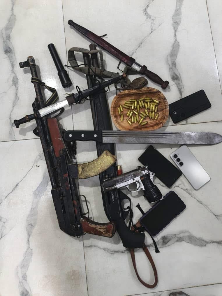 Recovered exhibits include one fabricated AK-47 rifle, 36 rounds of 9mm live ammunition, one locally-made pistol, one pump-action gun, two live cartridges, four mobile phones, two sharp knives, one cutlass, and nine torchlights used during the operation.